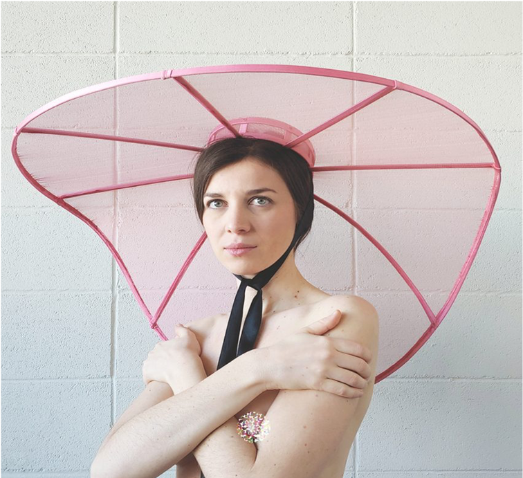 Veronica Toppino ha propuesto un gran sombrero con estructura de aluminio para que las personas se sientan protegidas, es muy usable, y está hecho con un marco de mimbre para usar sobre el cuerpo, protegerlo, y para aumentar la conciencia de la distancia física.
