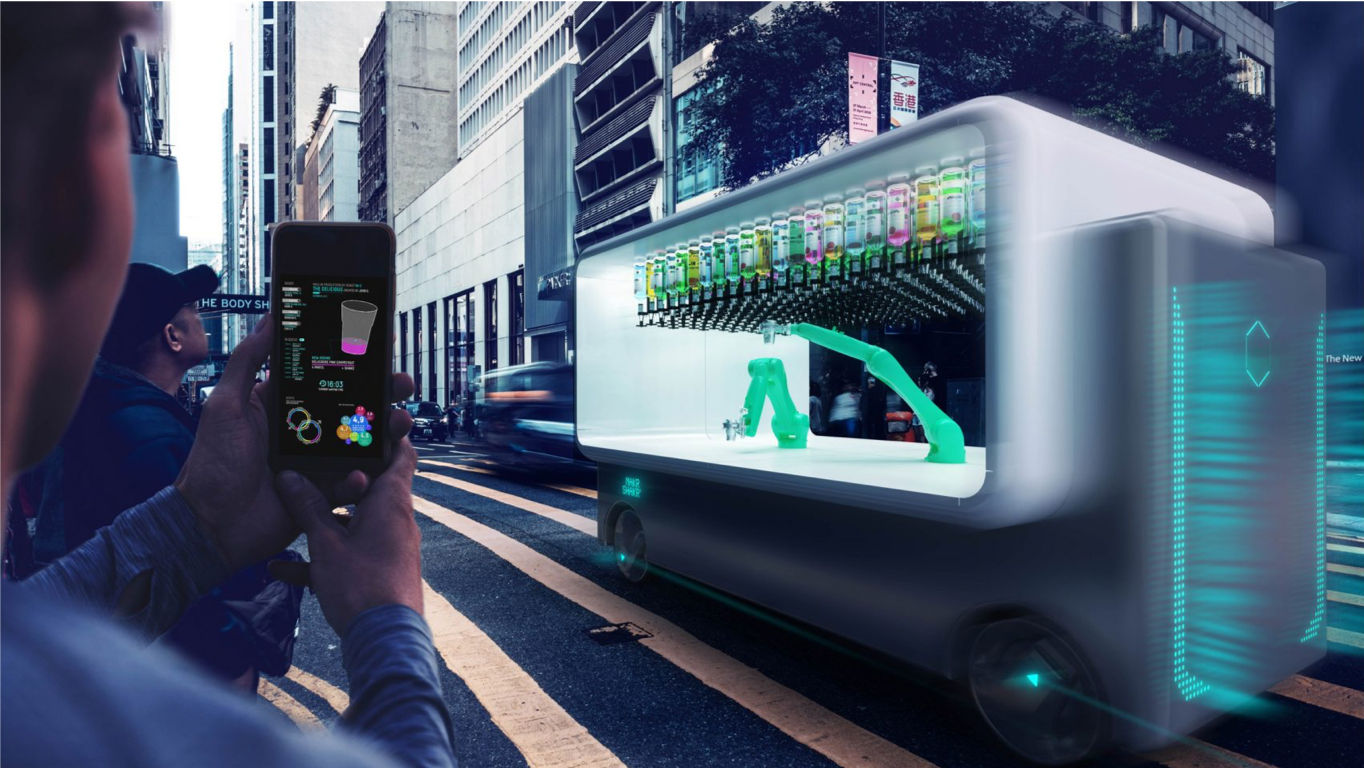 El arquitecto italiano Carlo Ratti ha presentado su concepto para una cafetería y bar autónomo robotizado que pueden preparar bebidas y hasta cocteles allí donde se localicen. El vehículo autónomo (sin conductor) consta de una unidad con dos brazos mecánicos, una para batir y la otra para servir. En segundos pueden preparar y servir la bebida solicitada desde la plataforma del vehículo en donde están montados.