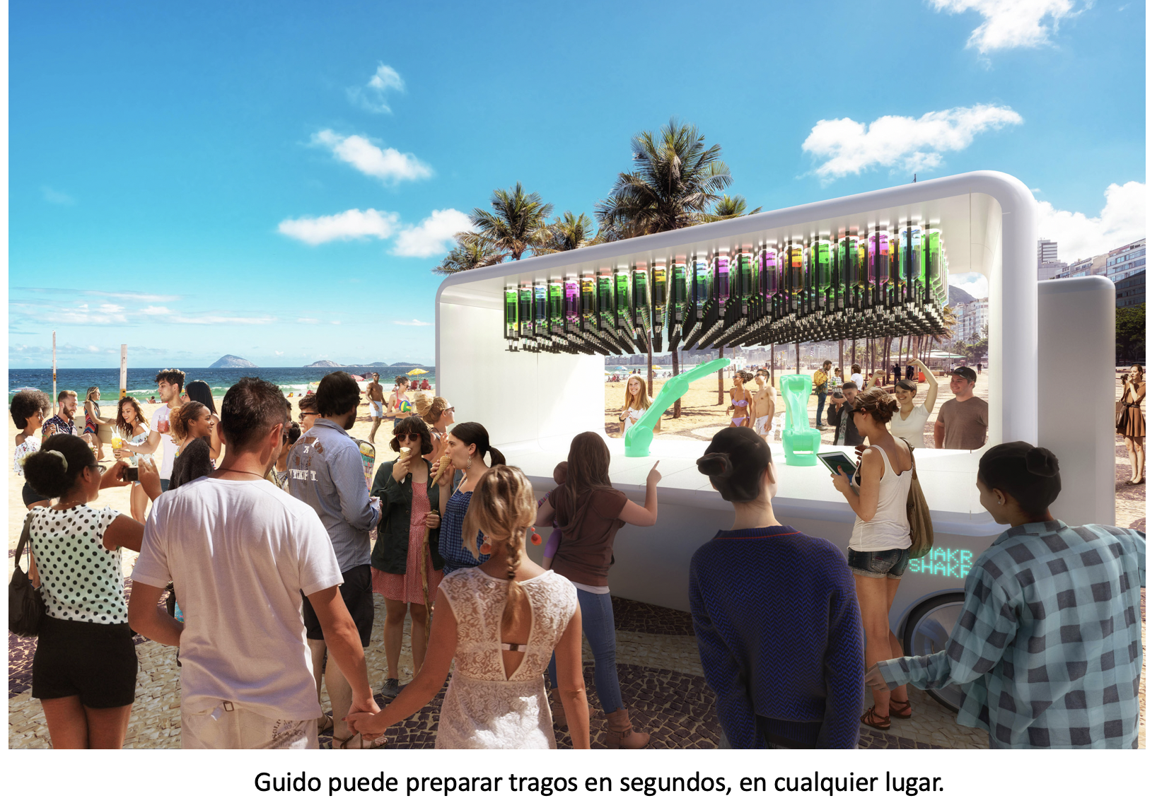 Presentado como el primer bar autónomo la idea se basa en un nuevo concepto del disfrute y de experiencias novedosas en ámbitos urbanos. El robot ha sido bautizado con el nombre de Guido.